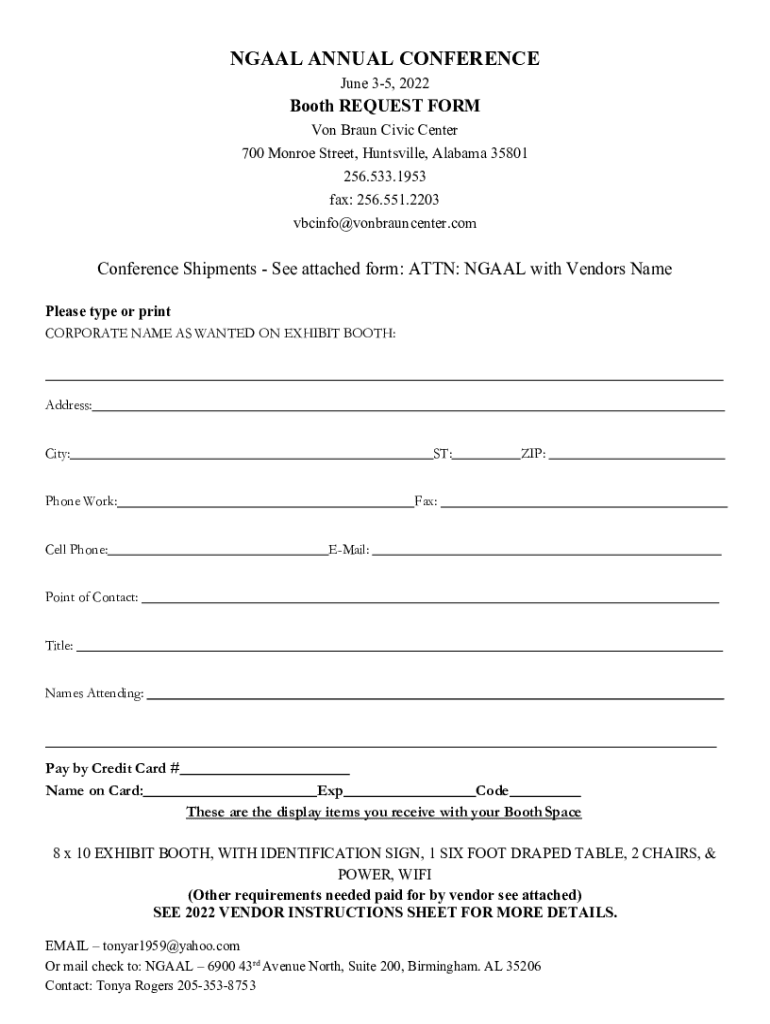 NG AAL ANNUAL CONFERENCE June 35, 2022Booth REQUEST FORM On Braun Civic Center 700 Monroe Street, Huntsville, Alabama 35801 256.533.1953 fax: 256.551.2203 vbcinfo@vonbrauncenter.comConference Shipments