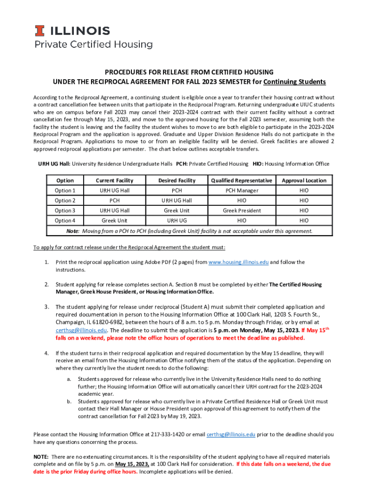 PROCEDURES FOR RELEASE FROM CERTIFIED HOUSING UNDER THE RECIPROCAL AGREEMENT FOR FALL 2023 SEMESTER for Continuing Students According to the Reciprocal Agreement, a continuing student is eligible