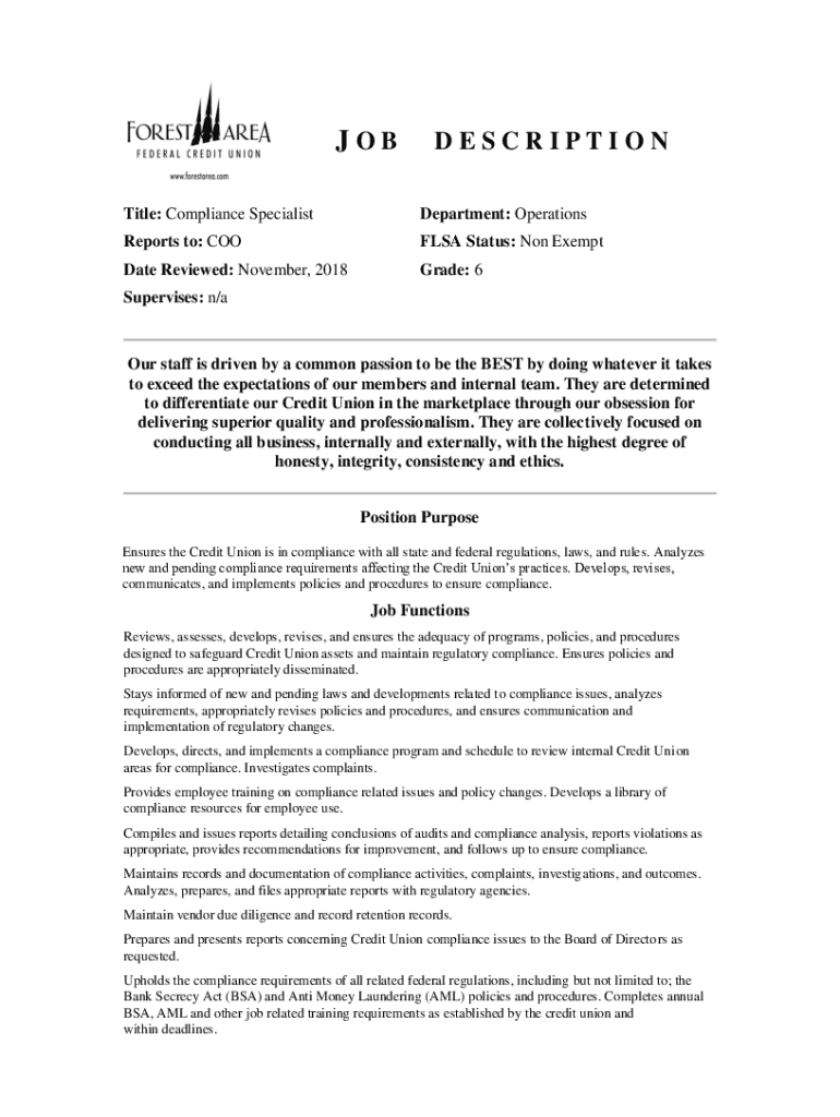JOBDESCRIPTIONTitle: Compliance SpecialistDepartment: OperationsReports to: COOLS Status: Non ExemptDate Reviewed: November, 2018Grade: 6Supervises: n/four staff members is driven by a common passion