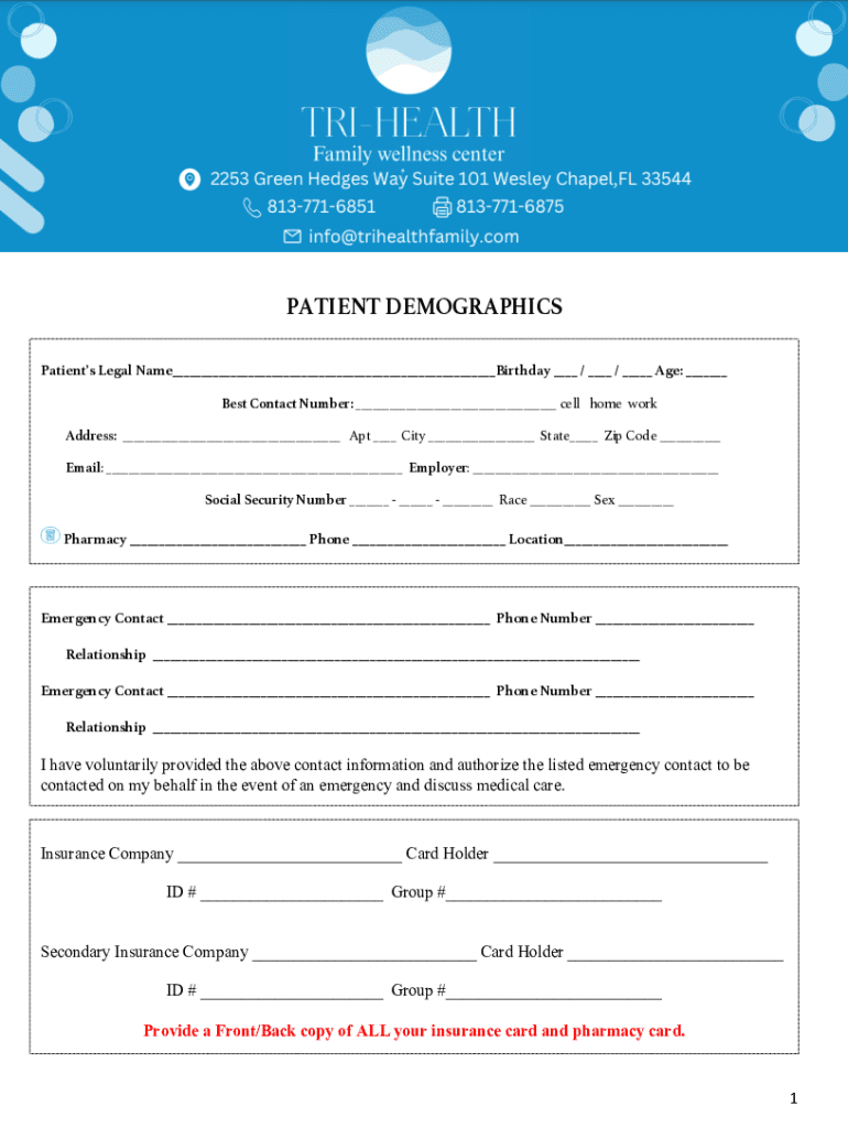 PATIENT DEMOGRAPHICS Patients Legal Name___Birthday ___ / ___ / ___ Age: ___ Best Contact Number: ___ cell homework Address: ___ Apt ___ City ___ State___ Zip Code ___ Email: ___ Employer: ___ Social