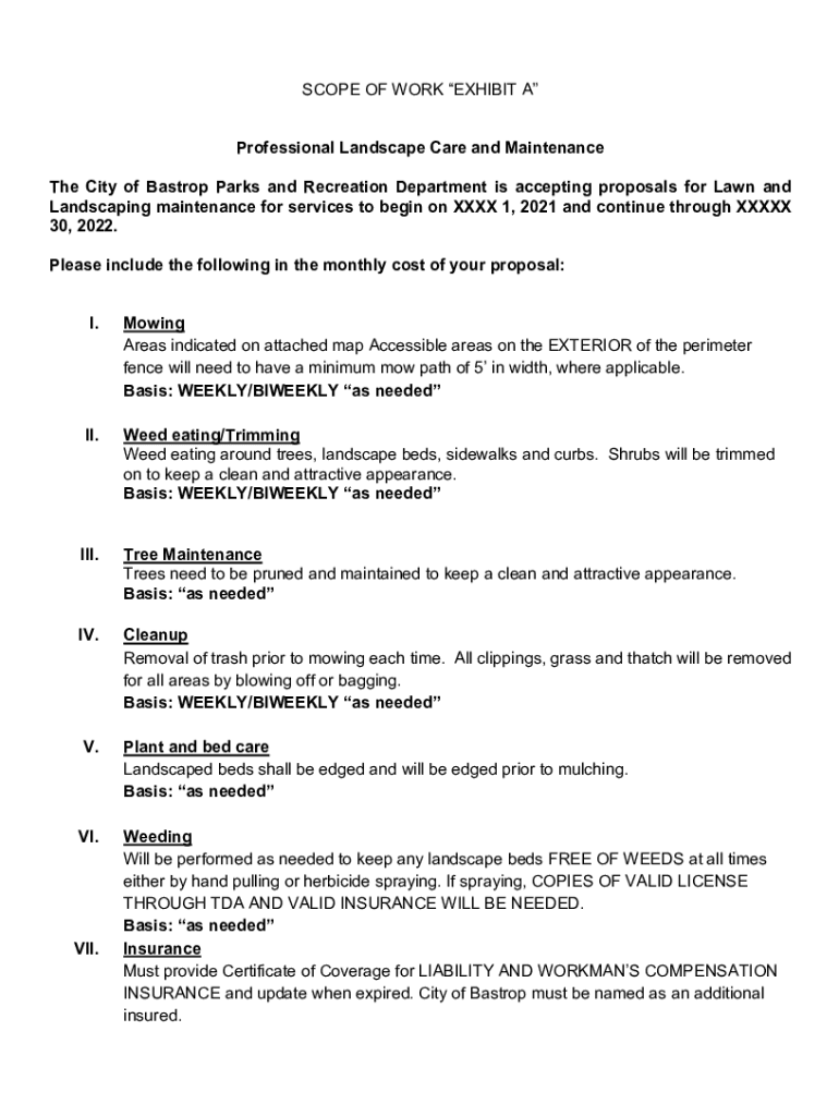 SCOPE OF WORK EXHIBIT A Professional Landscape Care and Maintenance The City of Bastrop Parks and Recreation Department is accepting proposals for Lawn and Landscaping maintenance for services to