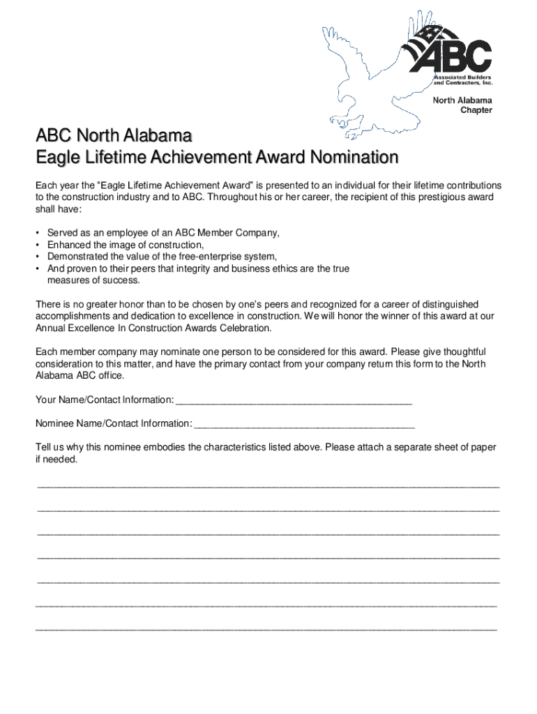 ABC North Alabama Eagle Lifetime Achievement Award Nomination Each year the Eagle Lifetime Achievement Award is presented to an individual for their lifetime contributions to the construction industry