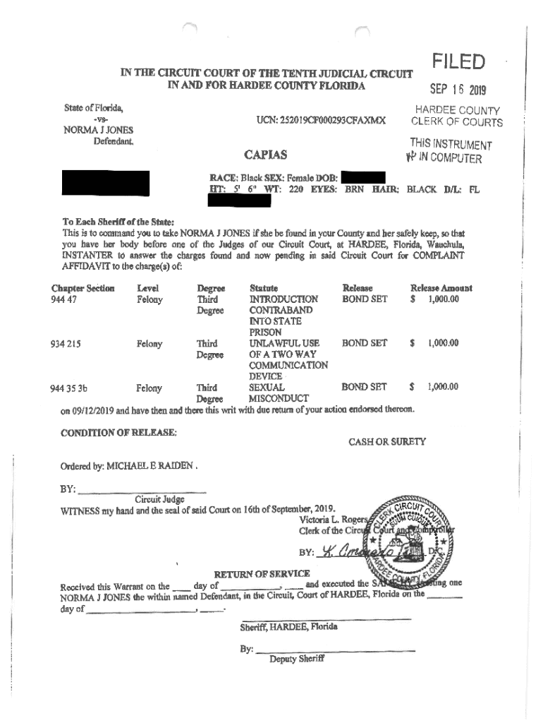 IN THE CIRCUIT COURT OF THE TENTH JUDICIAL CIRCUIT IN AND FOR HARDER COUNTY FLORIDA State of Florida, vs NORMA J JONES Defendant. FILED SEP 16 2019HARDEE COUNTY CLERK OF COURTS:252019CF000293CFAXMXTHIS