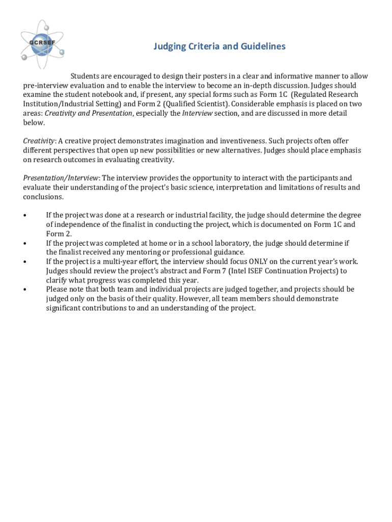 Judging Criteria and GuidelinesStudents are encouraged to design their posters in a clear and informative manner to allowpreinterview evaluation and to enable the interview to become an in depth discussion.