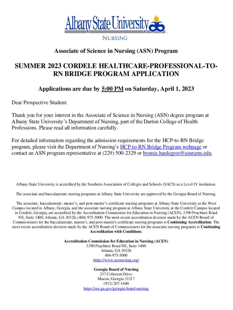 Associate of Science in Nursing (ASN) Programmer 2023 COR DELE HEALTHCAREPROFESSIONALTORN BRIDGE PROGRAM APPLICATION Applications are due by 5:00 PM on Saturday, April 1, 2023, Dear Prospective Student: