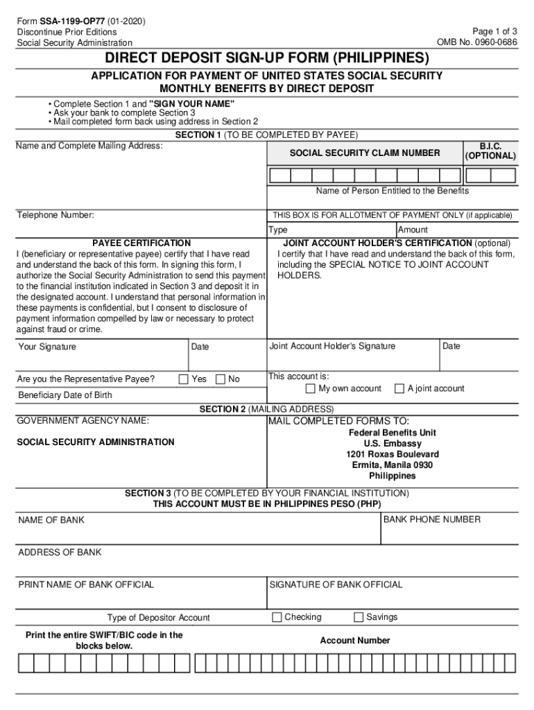 Form SSA1199OP77 (012020) Discontinue Prior Editions Social Security Administration Page 1 of 3 OMB No. 09600686DIRECT DEPOSIT SIGN UP FORM (PHILIPPINES) APPLICATION FOR PAYMENT OF UNITED STATES SOCIAL