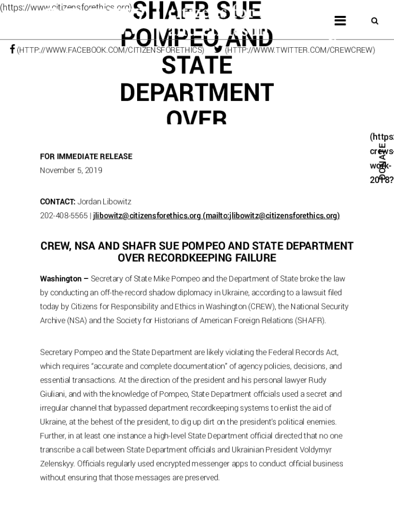 OVER(https://www.citizensforethics.org) (HTTP://WWW.FACEBOOK.COM/CITIZENSFORETHICS) (HTTP://WWW.TWITTER.COM/CREWCREW)November 5, 2019CONTACT: Jordan Horowitz