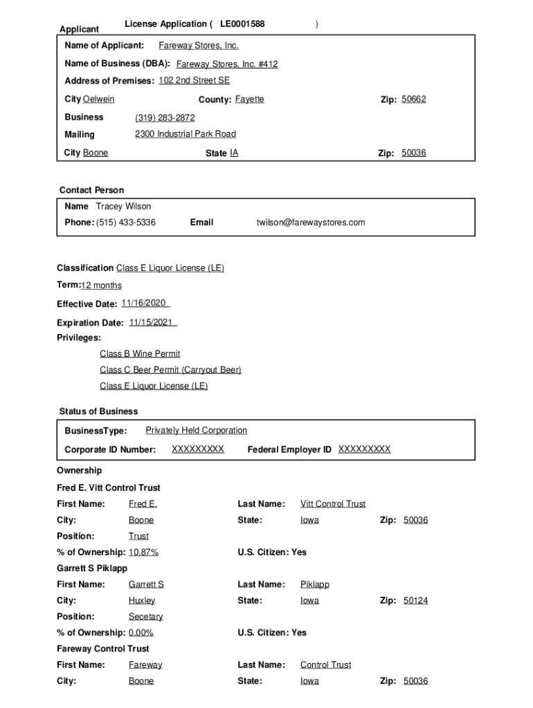 License Application (LE0001588ApplicantName of Applicant:)Fairway Stores, Inc. Name of Business (DBA): Fairway Stores, Inc. #412