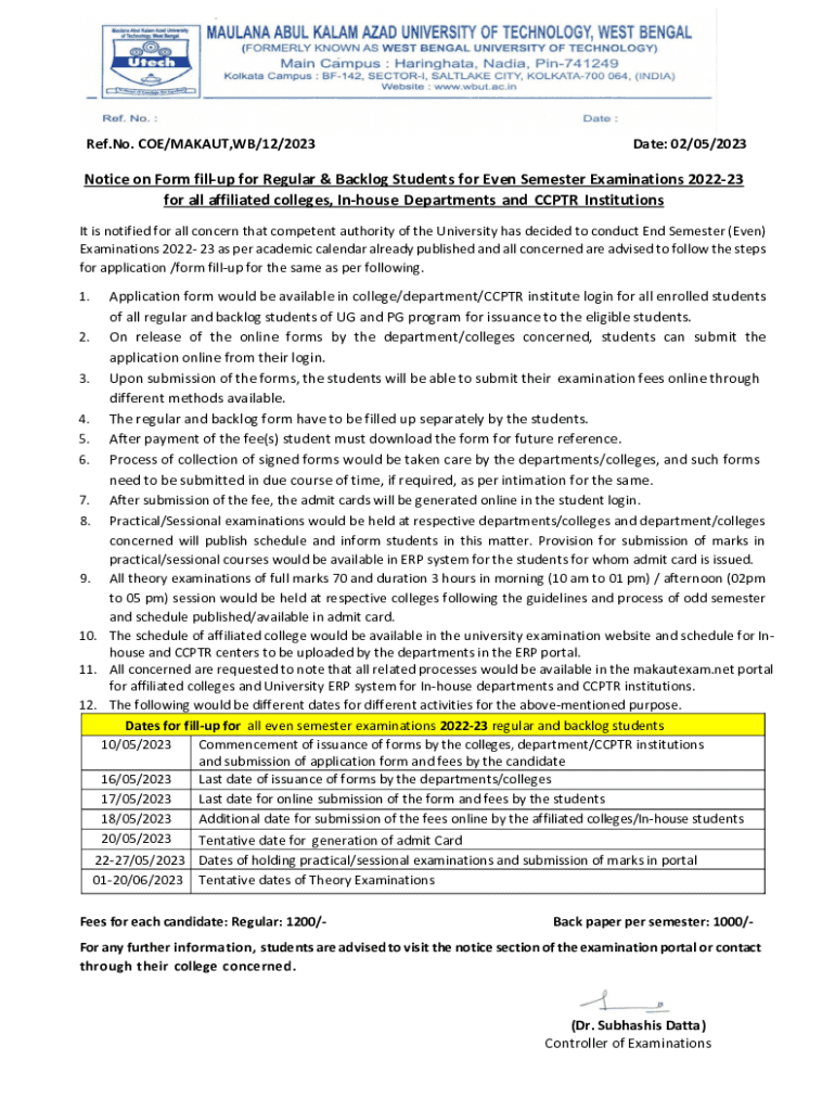 Ref.No. COE/MAK AUT, WB/12/2023Date: 02/05/2023Notice on Form fillip for Regular & Backlog Students for Even Semester Examinations 202223 for all affiliated colleges, In house Departments and CCPR