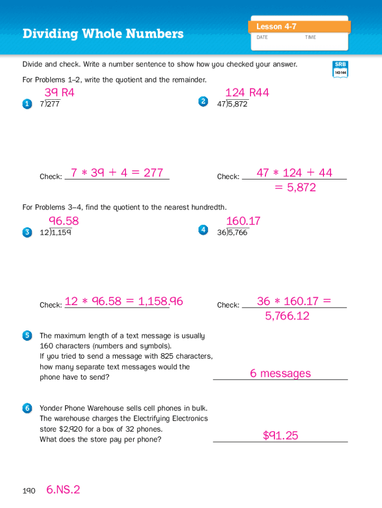 Lesson 47Dividing Whole Numerate Redivide and check. Write a number sentence to show how you checked your answer.SRB 143144For Problems 12, write the quotient and the remainder.39 ___ R4217277 Check:7