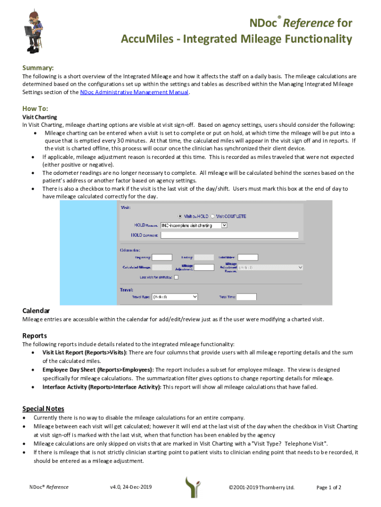 Doc Reference for Accurizes Integrated Mileage Functionality Summary: The following is a short overview of the Integrated Mileage and how it affects the staff on a daily basis. The mileage calculations