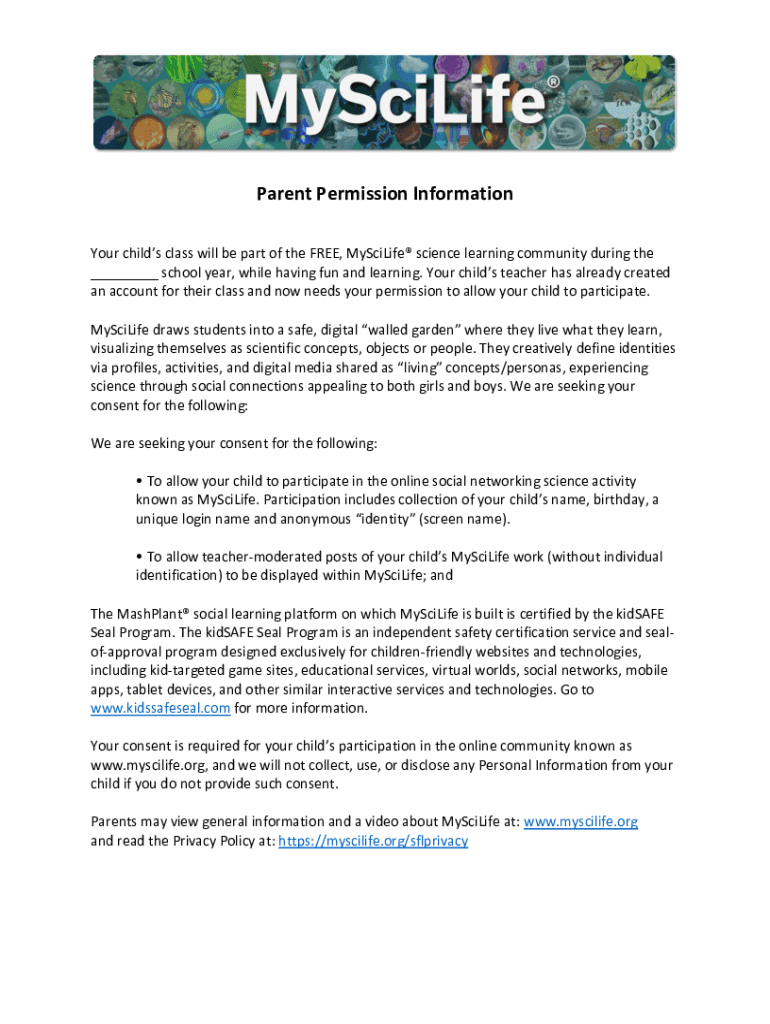 Parent Permission Information Your children class will be part of the FREE, Masculine science learning community during the ___ school year, while having fun and learning. Your children teacher has