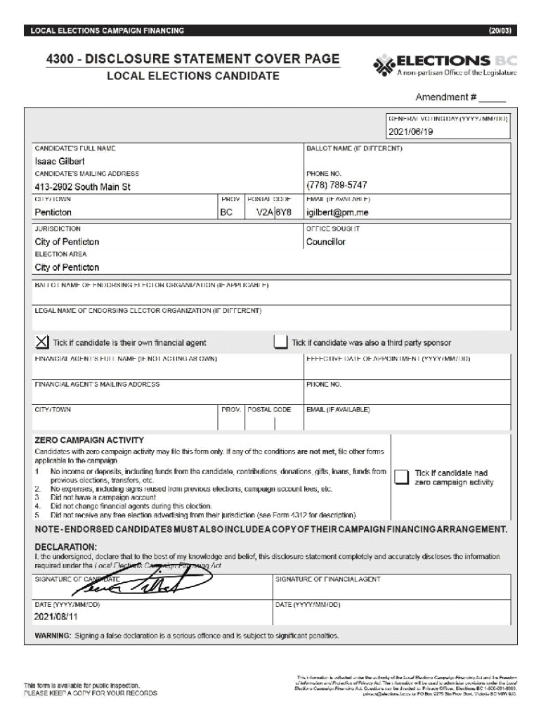 LOCAL ELECTIONS CAMPAIGN FINANCING(20/03)4300 DISCLOSURE STATEMENT COVER PAGE