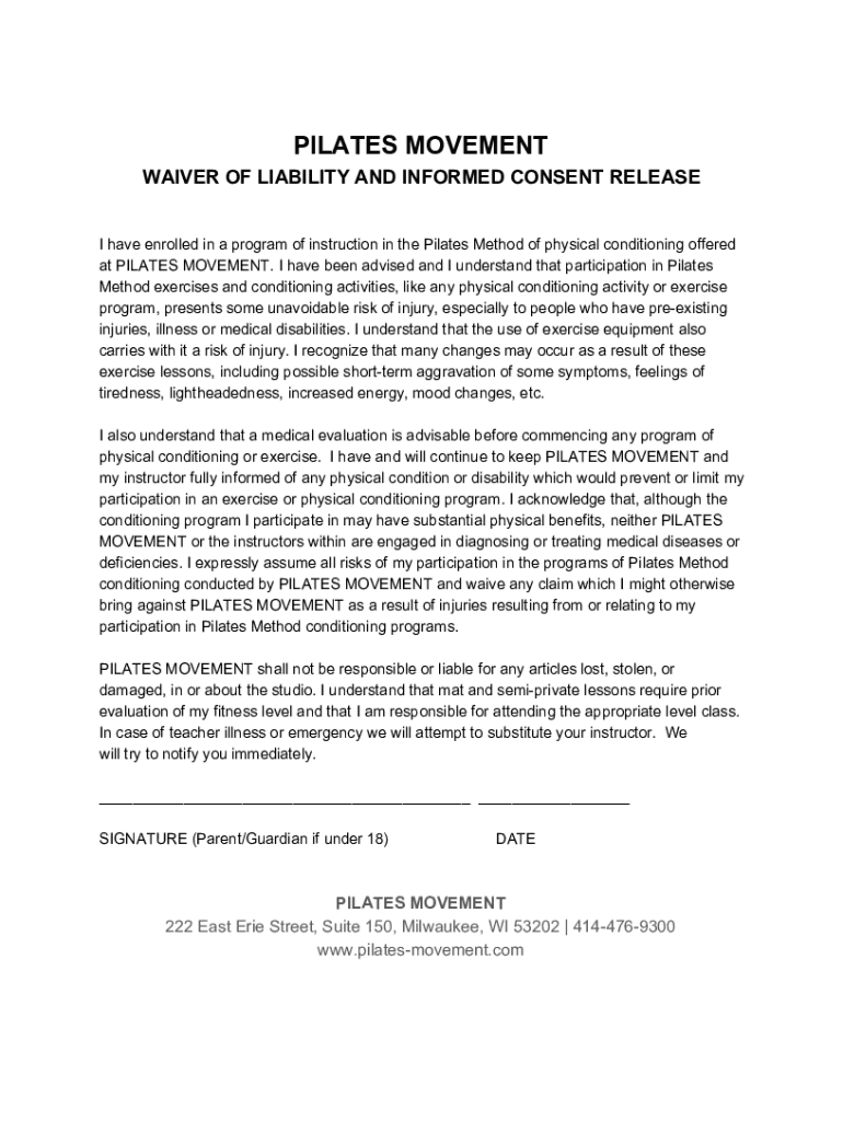 PILATESMOVEMENT WAIVEROFLIABILITYANDINFORMEDCONSENTRELEASE IhaveenrolledinaprogramofinstructioninthePilatesMethodofphysicalconditioningoffered atPILATESMOVEMENT. IhavebeenadvisedandIunderstandthatparticipationinPilates