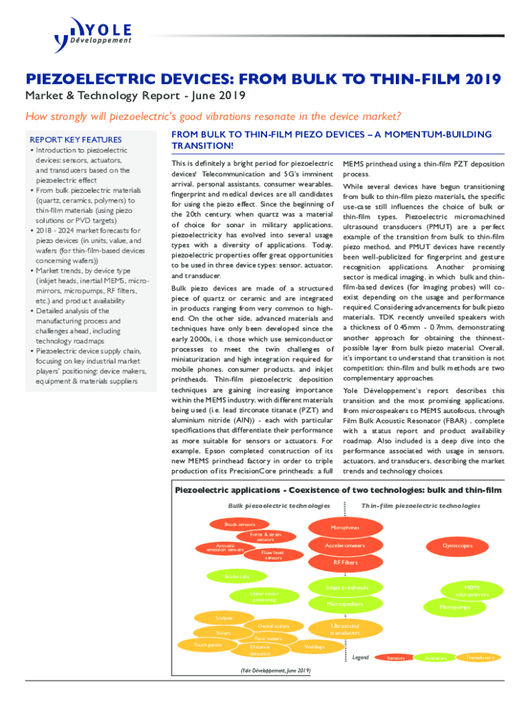 PIEZOELECTRIC DEVICES: FROM BULK TO THINKING 2019 Market & Technology Report June 2019How strongly will piezoelectric\'s good vibrations resonate in the device market? REPORT KEY FEATURES Introduction