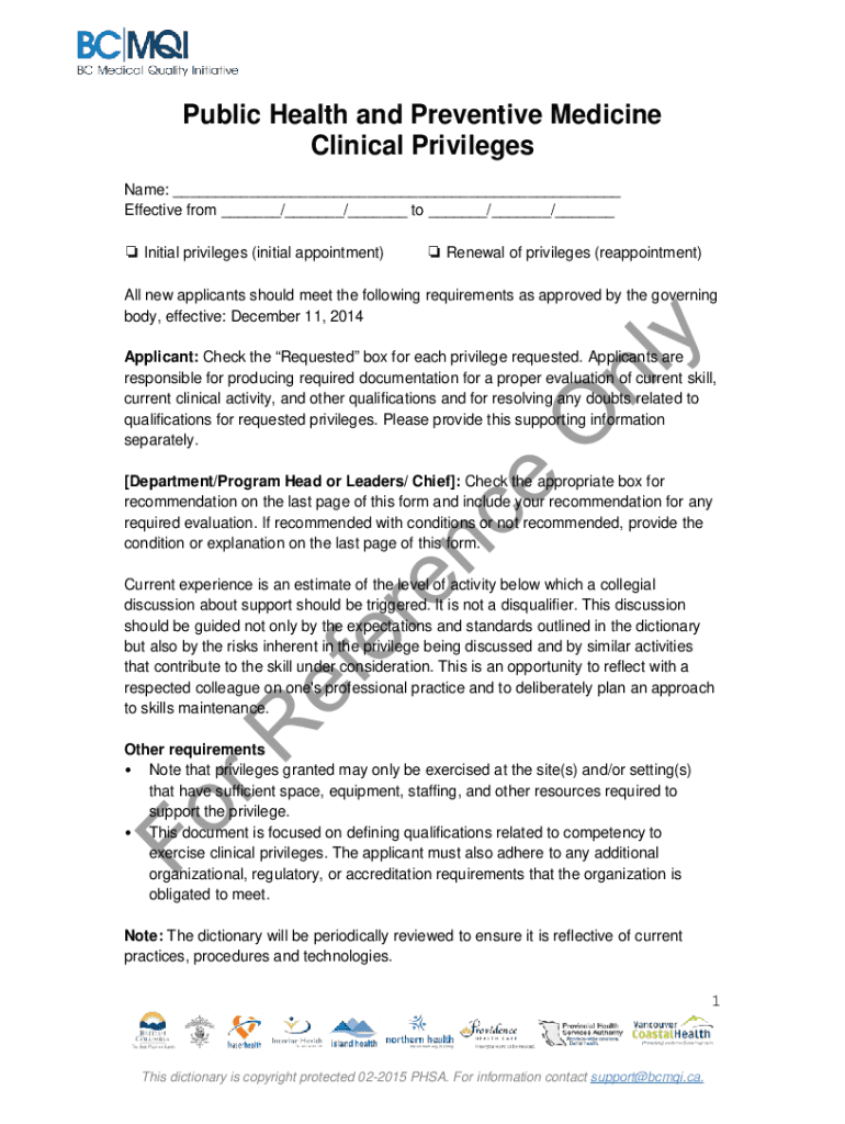 Public Health and Preventive Medicine Clinical Privileges Name: ___ Effective from ___/___/___ to ___/___/___ Initial privileges (initial appointment) Renewal of privileges (reappointment)All new