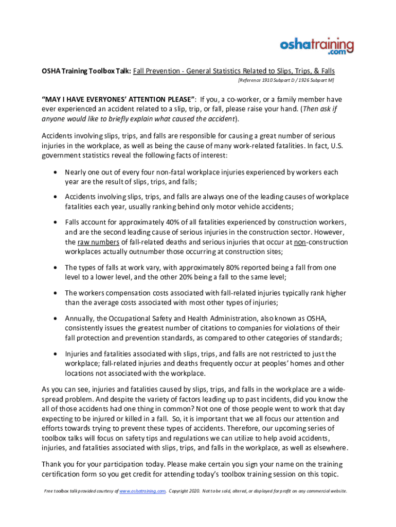 OSHA Training Toolbox Talk: Fall Prevention General Statistics Related to Slips, Trips, & Falls [Reference 1910 Subpart D / 1926 Subpart M]MAY I HAVE EVERYONE's ATTENTION PLEASE: If you, a coworker,