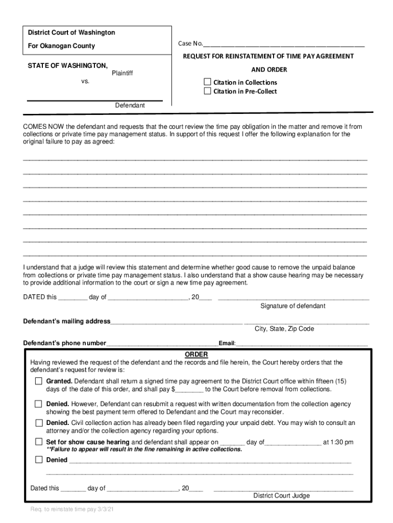 District Court of Washington Case No.___For Flanagan CountyREQUEST FOR REINSTATEMENT OF TIME PAY AGREEMENT STATE OF WASHINGTON, AND ORDERPlaintiff vs. Citation in Collections Citation in Recollect