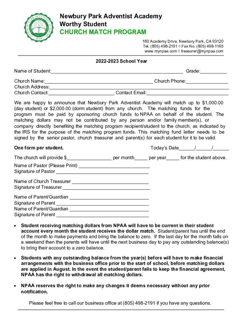 Newbury Park Adventist Academy Worthy Student CHURCH MATCH PROGRAM 180 Academy Drive, Newbury Park, CA 93120 Tel. (805) 4982191 Fax No. (805) 4981165 www.mynpaa.com treasurer@mynpaa.com20222023 School