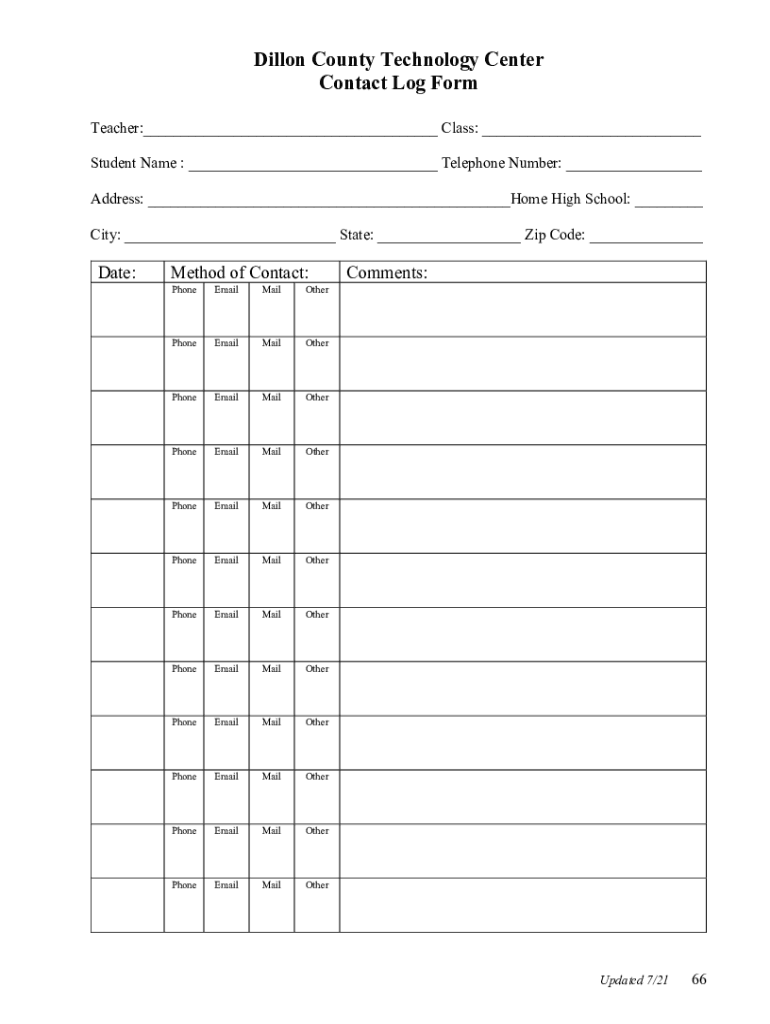 Dillon County Technology Center Contact Log Form Teacher:___ Class: ___ Student Name : ___ Telephone Number: ___ Address: ___Home High School: ___ City: ___ State: ___ Zip Code: ___Date:Method of