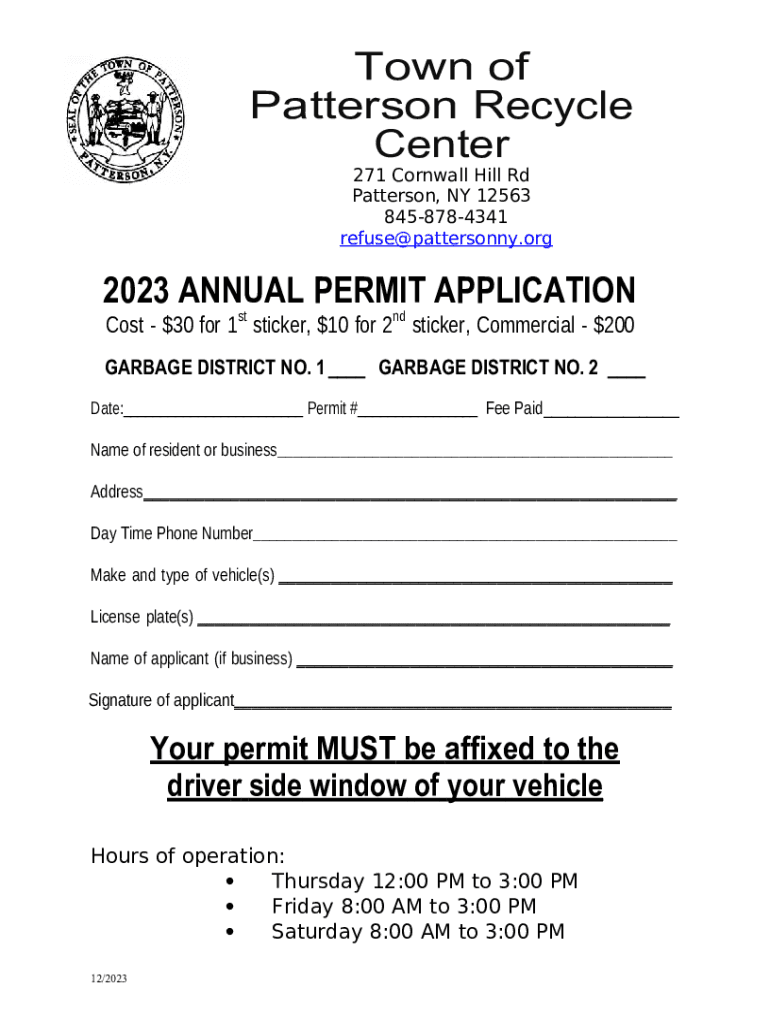 Town of Patterson Recycle Center 271 Cornwall Hill Rd Patterson, NY 12563 8458784341 refuse@pattersonny.org2023 ANNUAL PERMIT APPLICATION st ND Cost $30 for 1 sticker, $10 for 2 stickers, Commercial