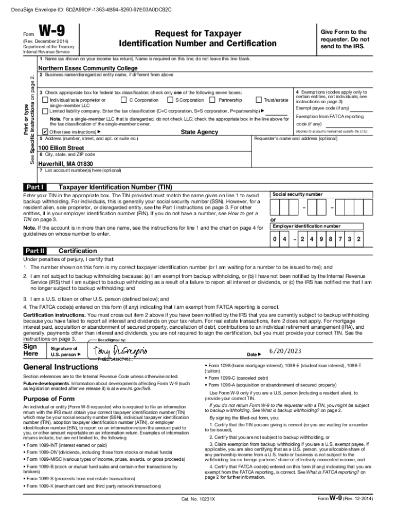 DocuSign Envelope ID: 6D2A99DF13634B94826097E03A0DC82CW9Form (Rev. December 2014) Department of the Treasury Internal Revenue ServiceRequest for Taxpayer Identification Number and CertificationGive
