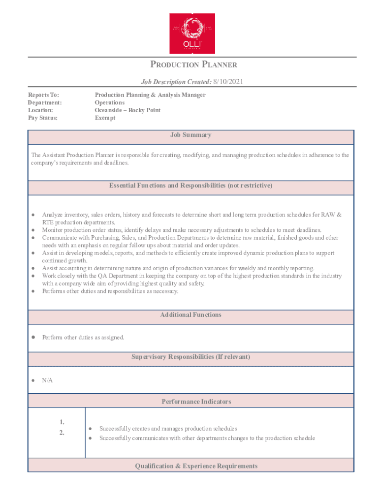 PRODUCTION PLANNER Job Description Created: 8/10/2021 Reports To: Department: Location: Pay Status:Production Planning & Analysis Manager Operations Oceanside Rocky Point Exempt Job Summary The Assistant