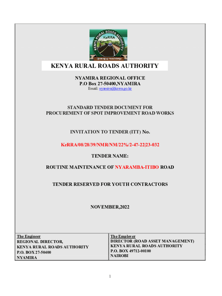 KENYA RURAL ROADS AUTHORITY SAMIRA REGIONAL OFFICE P. O Box 2750400,SAMIRA Email: nyamira@kerra.go.keSTANDARD TENDER DOCUMENT FOR PROCUREMENT OF SPOT IMPROVEMENT ROAD WORKSINVITATION TO TENDER (ITT)