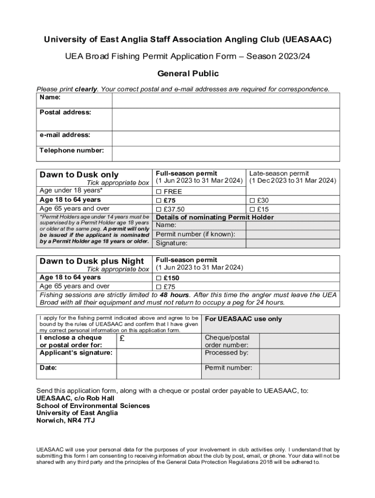University of East Anglia Staff Association Angling Club (ISAAC) SEA Broad Fishing Permit Application Form Season 2023/24 Public Please print clearly. Your correct postal and email addresses are required