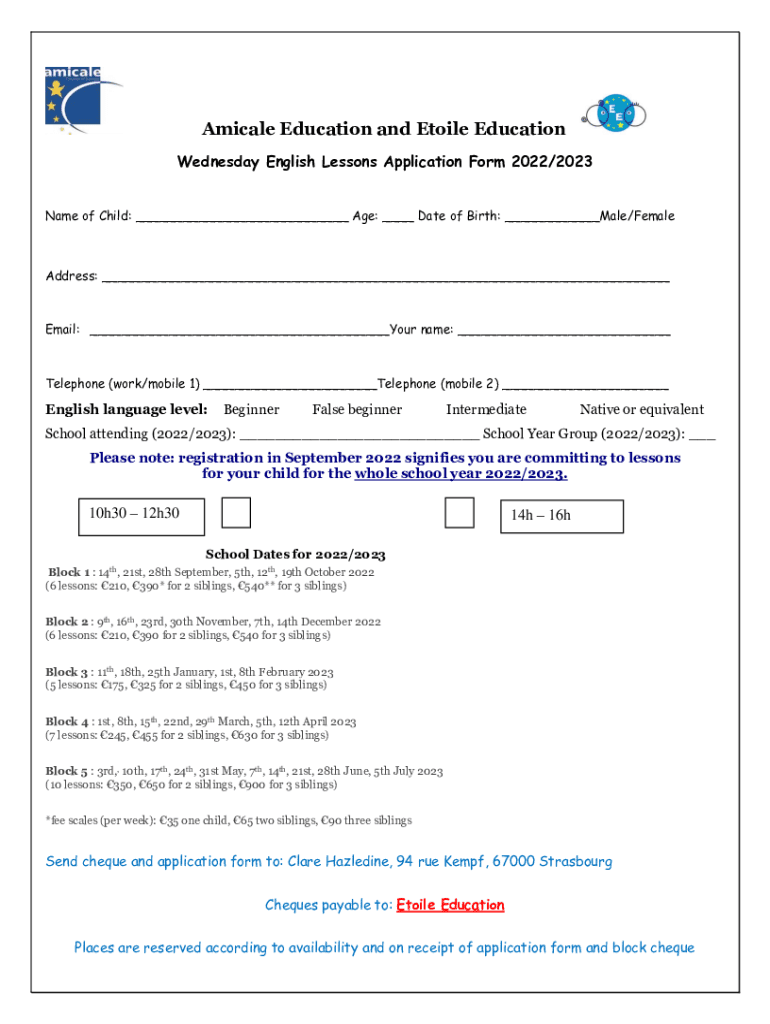 You can fill out the Wednesday English lessons application by providing all the necessary information requested on the form.