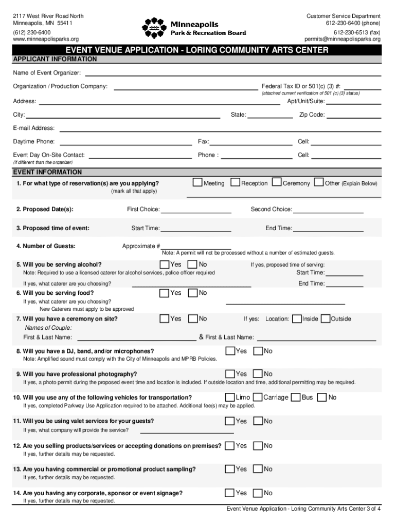 Minneapolis Park and Recreation Board 2117 West River Road North Minneapolis, MN 55411 www.minneapolisparks.orgCustomer Service Department 6122306400 (phone) 6122306513 (fax) permits@minneapolisparks.orgAPPLICATION