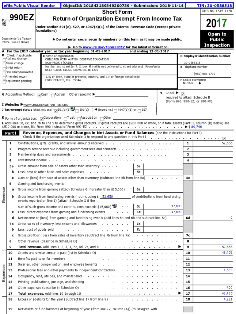 File Public Visual RenderObjectId: 201843189349200739 Submission: 20181114TIN: 300588518Short Form Return of Organization Exempt From Income Tax990EZFormOMB No. 154511502017Under section 501(c), 527,