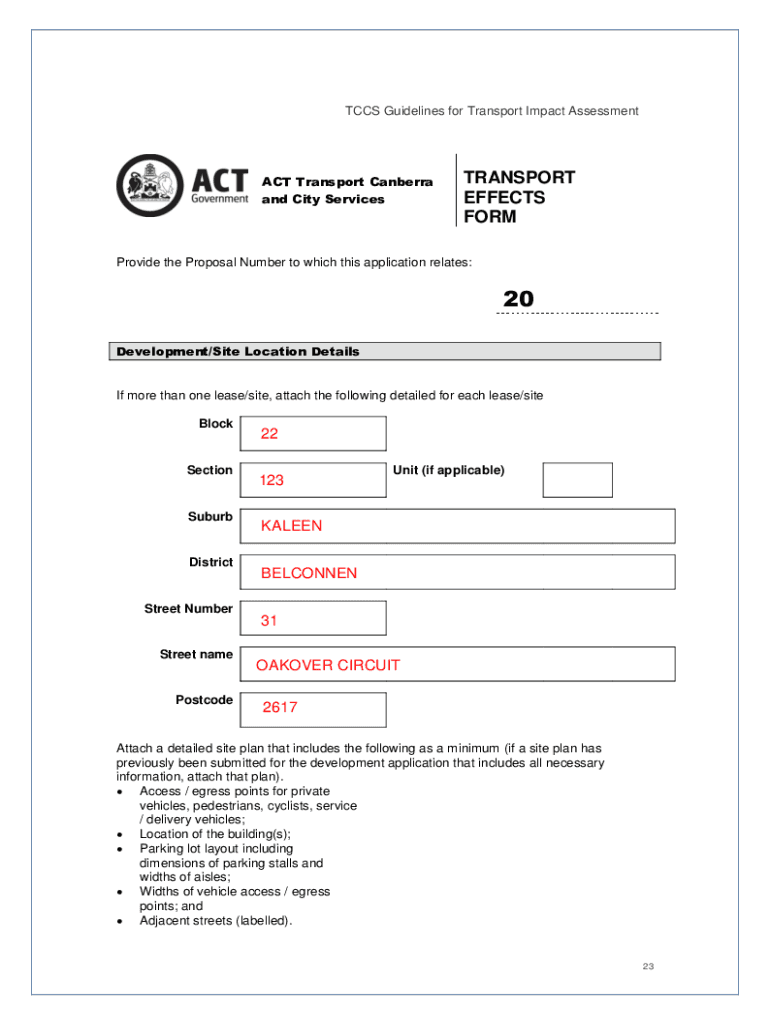 CCS Guidelines for Transport Impact Assessment ACT Transport Canberra and City ServicesTRANSPORT EFFECTS FORMProvide the Proposal Number to which this application relates:20 Development/Site Location