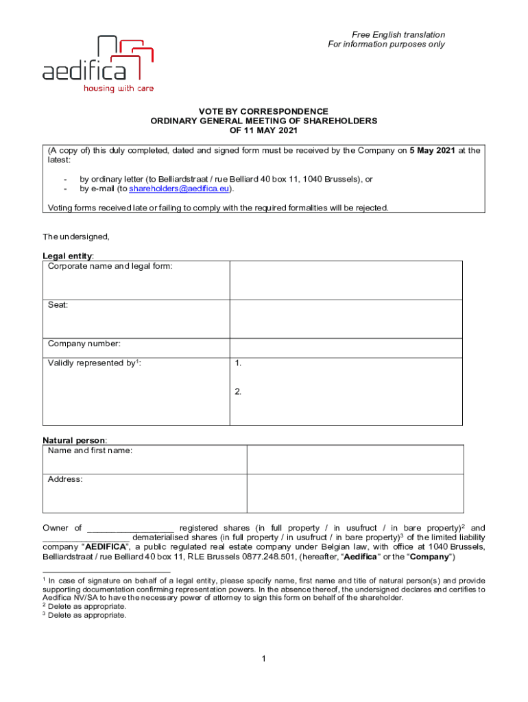 Free English translation For information purposes outvote BY CORRESPONDENCE ORDINARY GENERAL MEETING OF SHAREHOLDERS OF 11 MAY 2021 (A copy of) this duly completed, dated and signed form must be received