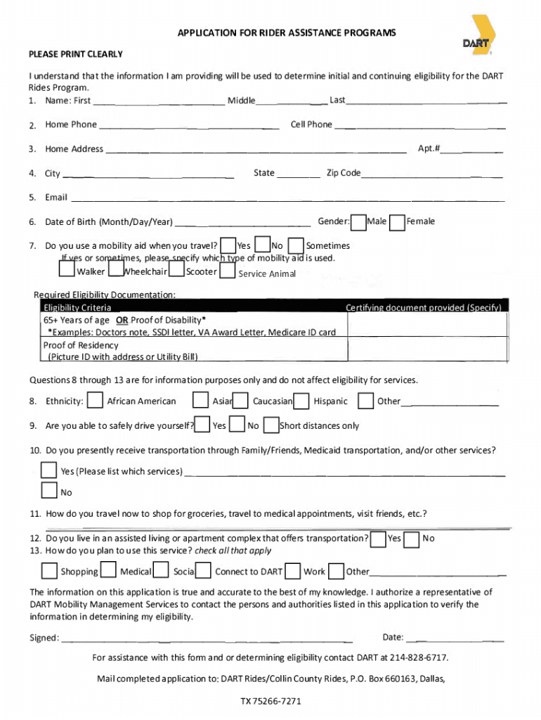 APPLICATION FOR RIDER ASSISTANCE PROGRAMS PLEASE PRINT CLEARLY I understand that the information I am providing will be used to determine initial and continuing eligibility for the DART Rides Program.
