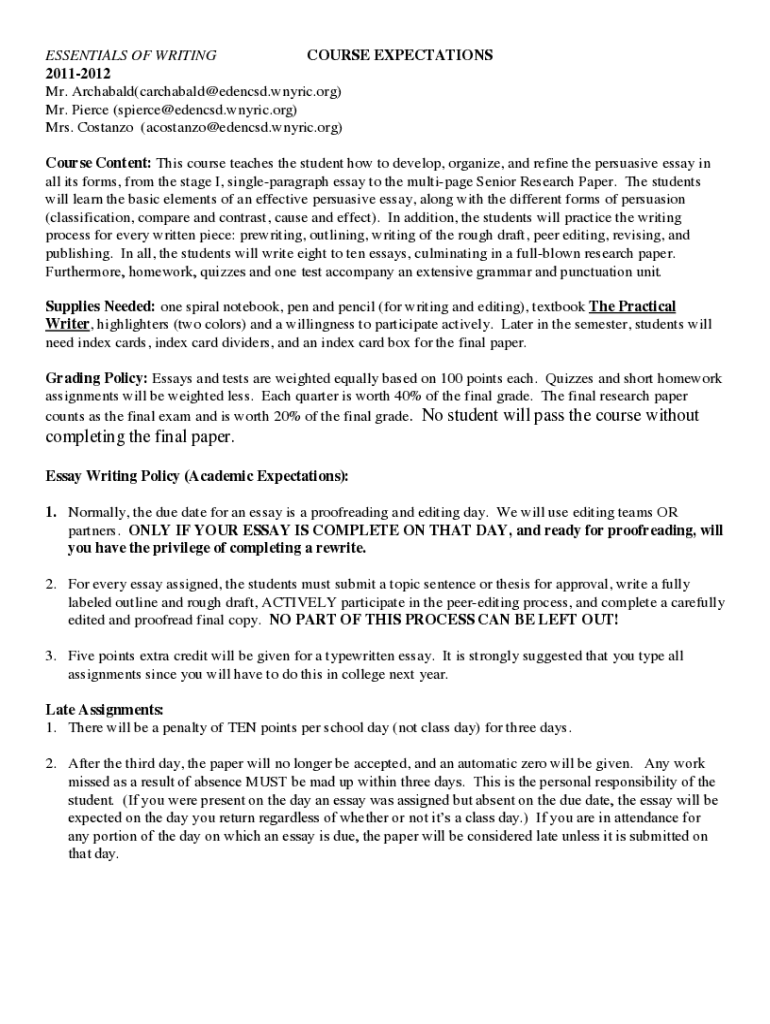 ESSENTIALS OF WRITING COURSE EXPECTATIONS 20112012 Mr. Archibald(carchabald@edencsd.wnyric.org) Mr. Pierce (spierce@edencsd.wnyric.org) Mrs. Costansó (acostanzo@edencsd.wnyric.org) Course Content: