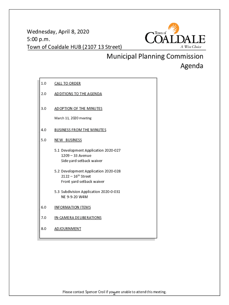 Wednesday, April 8, 2020 5:00 p.m. Town of Coal dale HUB (2107 13 Street)Municipal Planning Commission Agenda 1.0CALL TO ORDER2.0ADDITIONS TO THE AGENDA3.0ADOPTION OF THE MINUTES March 11, 2020 meeting4.0BUSINESS