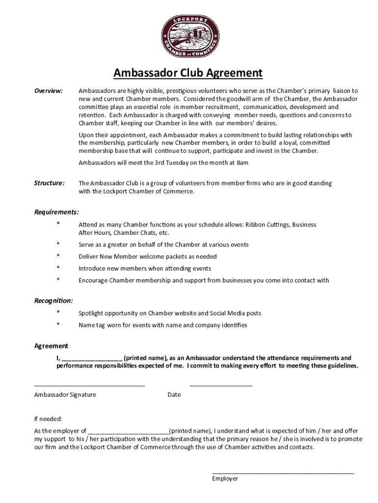 Ambassador Club Agreement Overview:Ambassadors are highly visible, prestigious volunteers who serve as the Chambers primary liaison to new and current Chamber members. Considered the goodwill arm