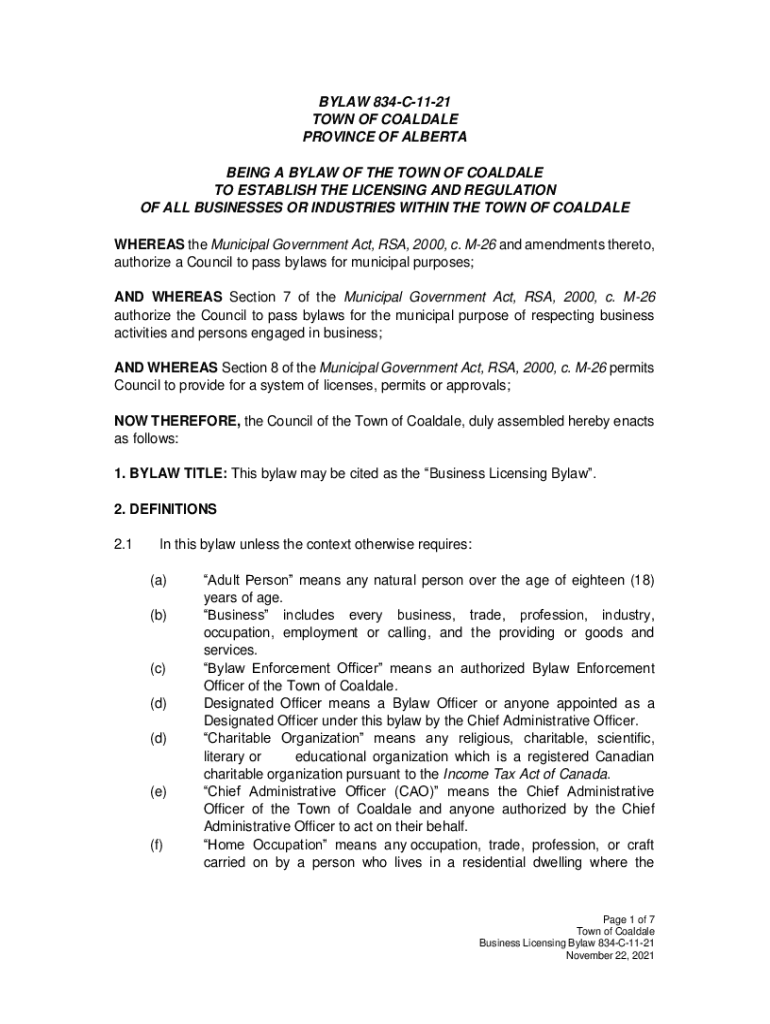 BYLAW 834C1121 TOWN OF COALFACE PROVINCE OF ALBERTA BEING A BYLAW OF THE TOWN OF COALFACE TO ESTABLISH THE LICENSING AND REGULATION OF ALL BUSINESSES OR INDUSTRIES WITHIN THE TOWN OF COALFACE WHEREAS