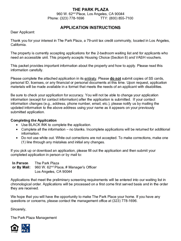 THE PARK PLAZA 960 W. 62nd Place, Los Angeles, CA 90044 Phone: (323) 7781696 TTY: (800) 8557100APPLICATION INSTRUCTIONS Dear Applicant: Thank you for your interest in The Park Plaza, a 79unit tax
