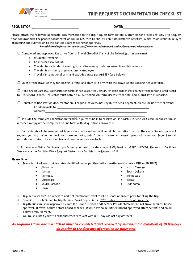 Trip Request Documentation Checklist is not the form you're looking for?Search for another form here.