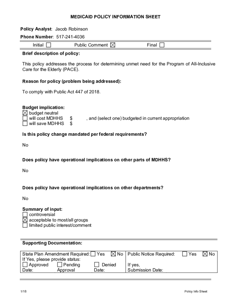 MEDICAID POLICY INFORMATION SHEET Policy Analyst: Jacob Robinson Phone Number: 5172414036 InitialPublic CommentFinalBrief description of policy: This policy addresses the process for determining unmet