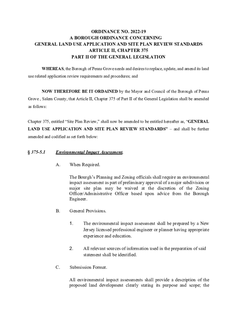 ORDINANCE NO. 202219 A BOROUGH ORDINANCE CONCERNING GENERAL LAND USE APPLICATION AND SITE PLAN REVIEW STANDARDS ARTICLE II, CHAPTER 375 PART II OF THE GENERAL LEGISLATION WHEREAS, the Borough of Penn's
