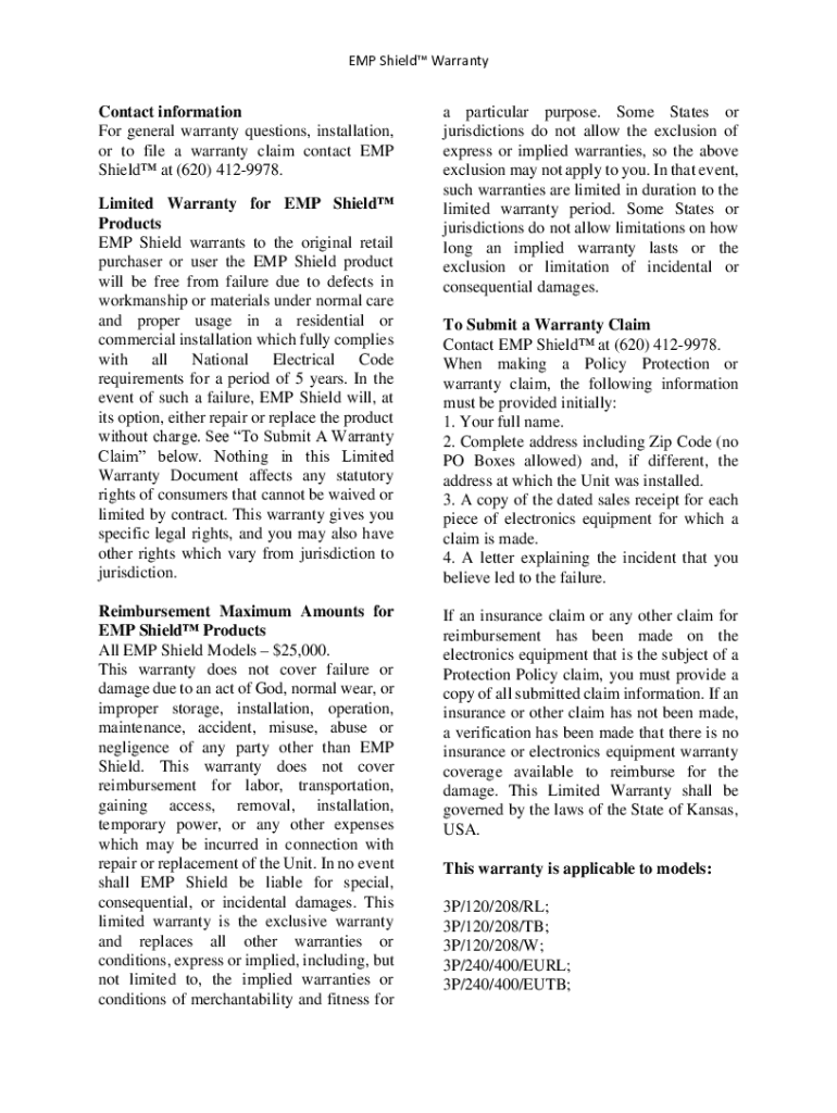 EMP Shield WarrantyContact information For general warranty questions, installation, or to file a warranty claim contact EMP Shield at (620) 4129978. Limited Warranty for EMP Shield Products EMP Shield