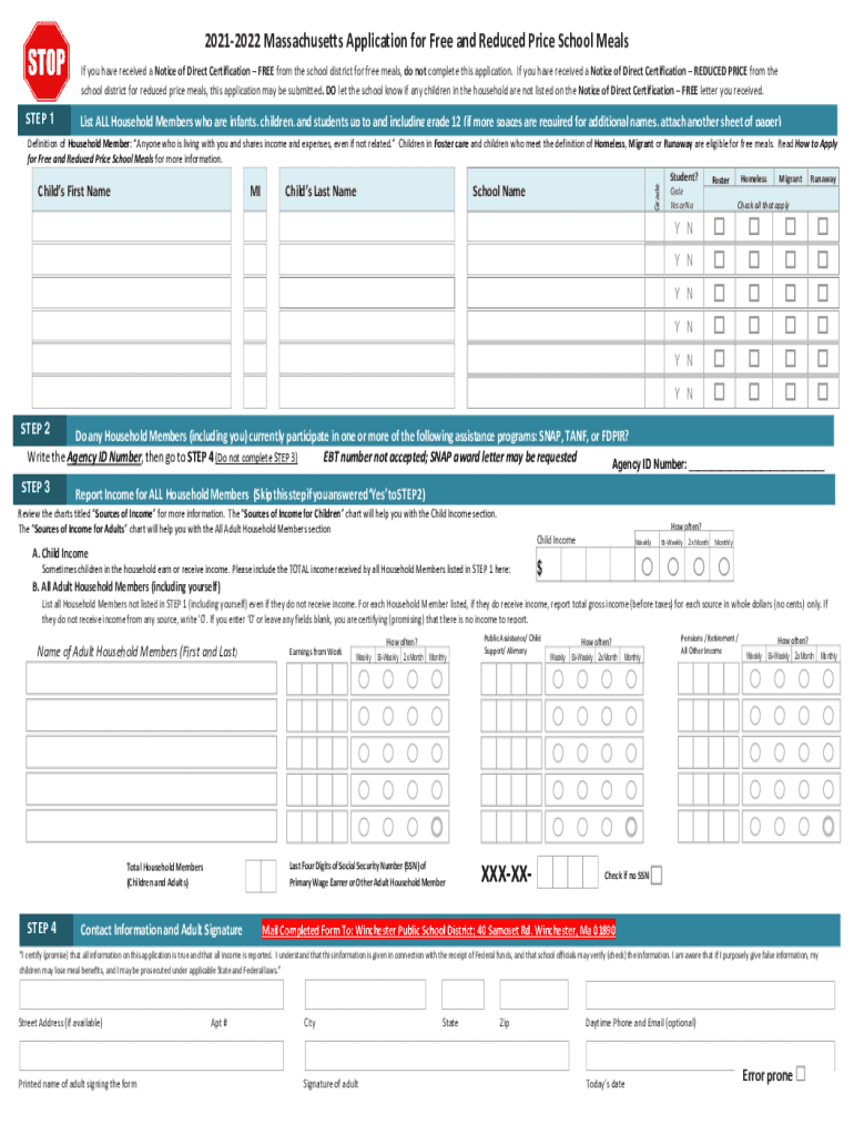 20212022 Massachusetts Application for Free and Reduced Price School Meals If you have received a Notice of Direct Certification FREE from the school district for free meals, do not complete this