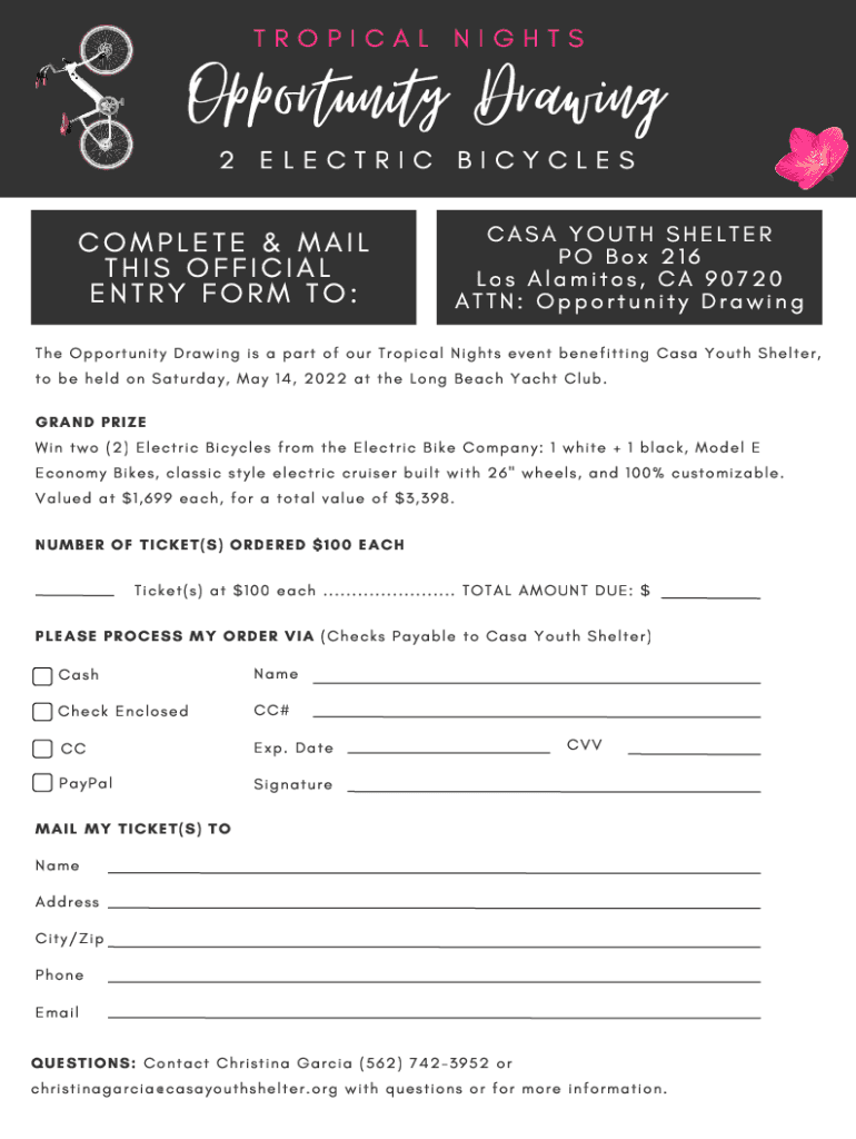 T R O P I C A LN I G H TS Opportunity Drawing 2COMPLETE THIS L E C T R I C&MAILOFFICIALENTRYFORMTO:B I C Y C L E SCARAMOUCH Poles ATTN:BoxAlamitos, SHELTER 216 CAOpportunity90720 Drawing Opportunity