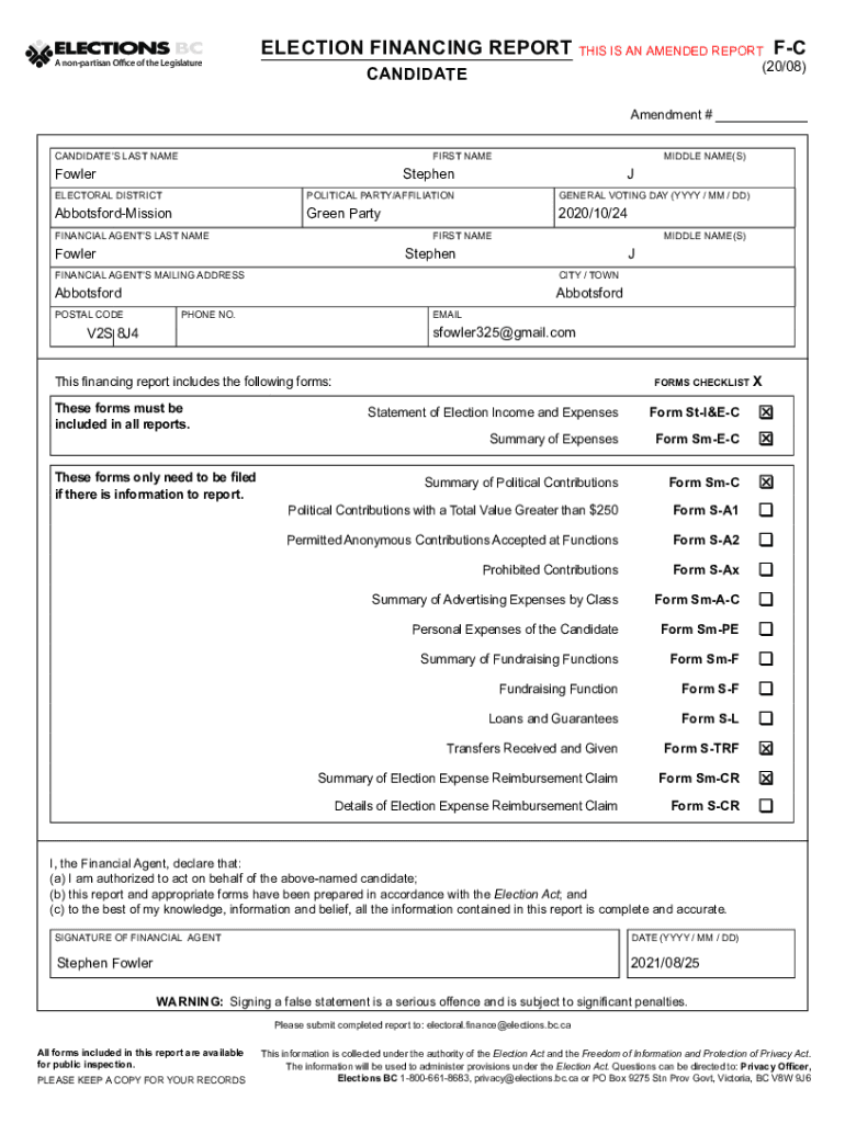CA nonpartisan Office of the LegislatureELECTION FINANCING REPORTS IS AN AMENDED REPORT FC(20/08)CANDIDATE