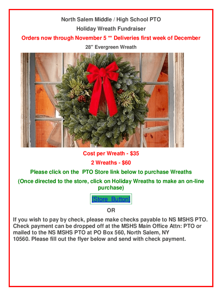 North Salem Middle / High School PTO Holiday Wreath Fundraiser Orders now through November 5 ** Deliveries first week of December 28\” Evergreen Wreaths per Wreath $35 2 Wreaths $60 Please click