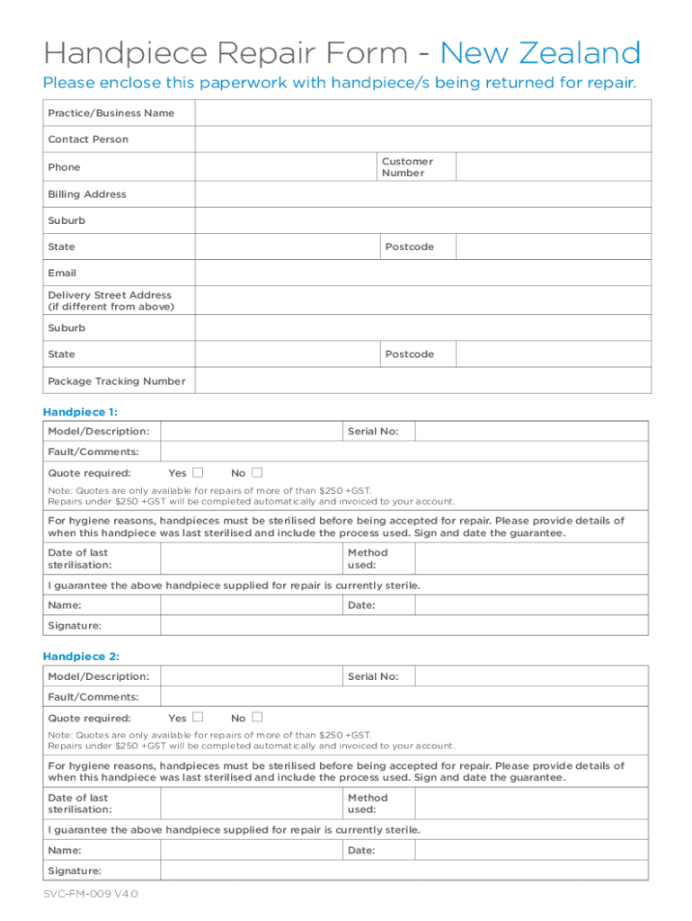 Hand piece Repair Form New Zealand Please enclose this paperwork with hand piece/s being returned for repair. Practice/Business Name Contact Person Customer NumberPhone Billing Address Suburb StatePostcodeEmail