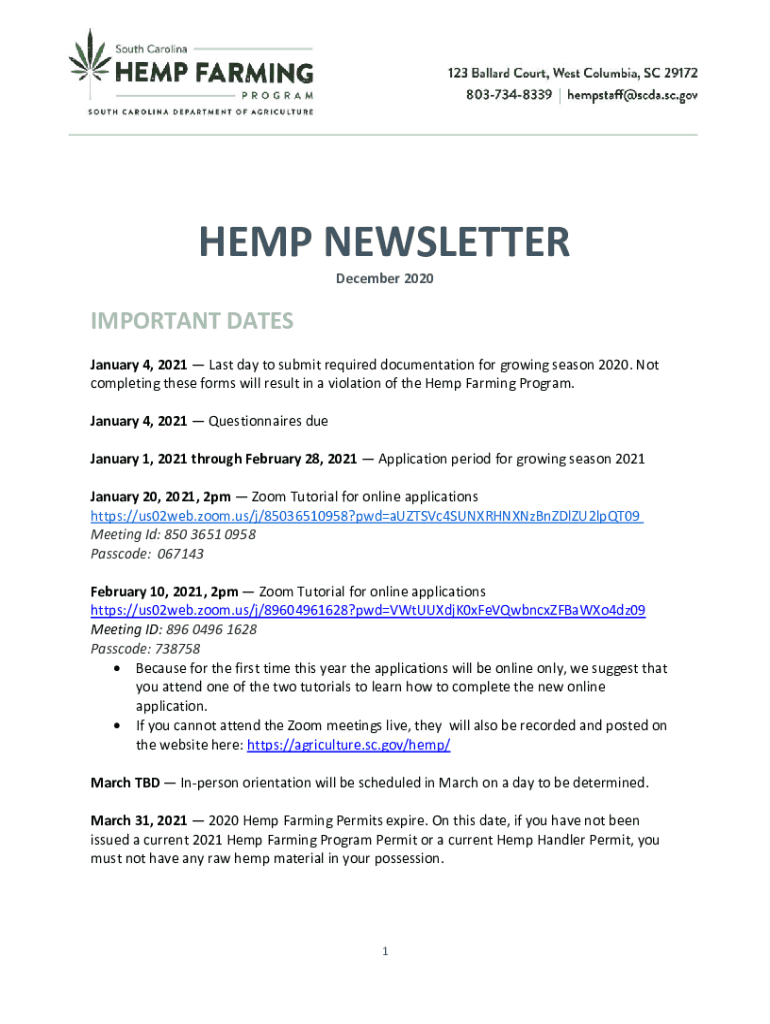 HEMP NEWSLETTER December 2020IMPORTANT DATES January 4, 2021, Last day to submit required documentation for growing season 2020. Not completing these forms will result in a violation of the Hemp Farming